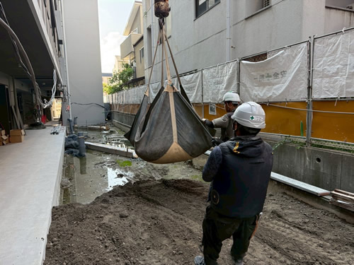 表からラフタークレーンでのモッコを使って土の搬入を行いました。